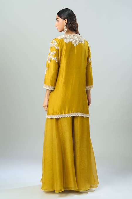Yellow straight kurta featuring intricate pearl, sequin, and thread embroidery in a botanical pattern. Paired with a solid sharara and an embroidered dupatta.