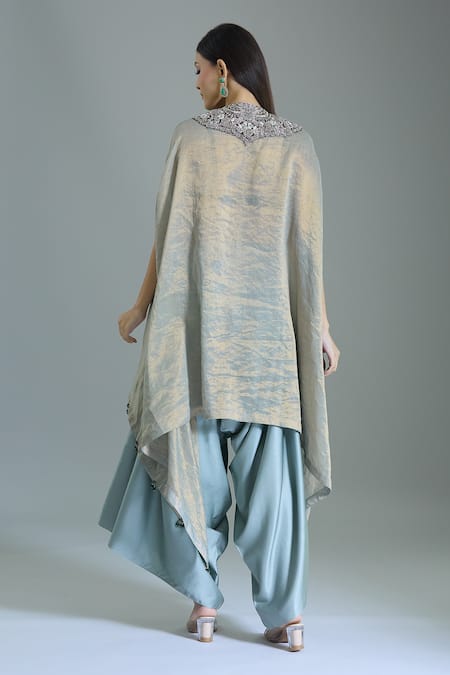 Buy_Prisho_Blue Tissue Beads V-neck Floral Embroidered Yoke Kaftan And Draped Pant _Online_at_Aza_Fashions