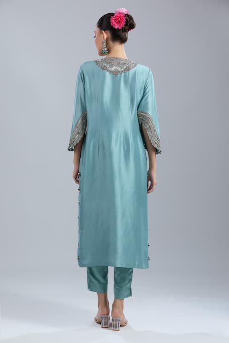 Blue Embroidery, Beads, Sequins Round Neck Kurta Pant Set