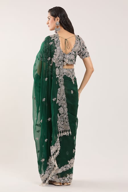 Bottle green saree featuring floral and paisley moti embroidered hem. Paired with an embroidered blouse with side zipper closure.