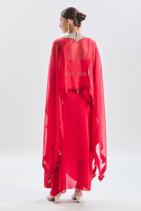 Red sheer cape featuring floral cutdana embroidery and tassel accents. Paired with a matching inner blouse and draped skirt.