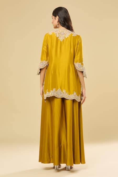 Yellow kurta featuring resham and applique floral embroidery. Paired with a solid flared pant and an embroidered scallop hem dupatta.