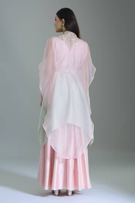 Buy_Prisho_Pink Organza Beads, Embroidery V-neck Floral Vine Cape With Draped Pant Set _at_Aza_Fashions
