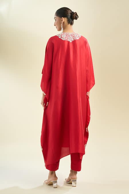 Red kaftan featuring intricate gota embellishments and a relaxed silhouette. Paired with matching red pants for a coordinated look.