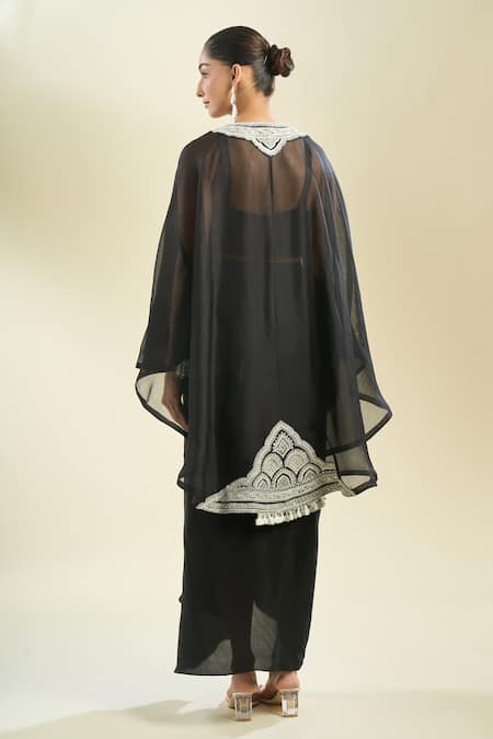 Intricate resham embroidery on the neckline, Flowy cape with embellished edges