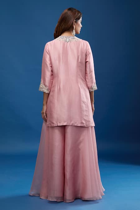 A pink kurta featuring resham embroidery on the neckline, sleeves, and hem. Paired with a coordinating pink sharara and a pink dupatta with resham embroidery along its border.