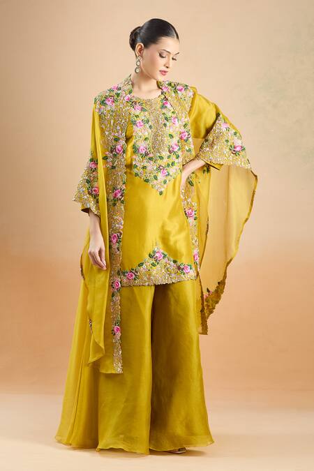 Yellow kurta featuring resham floral embroidery and a round neckline. Paired with matching palazzo pants for a coordinated look. Comes with dupatta.