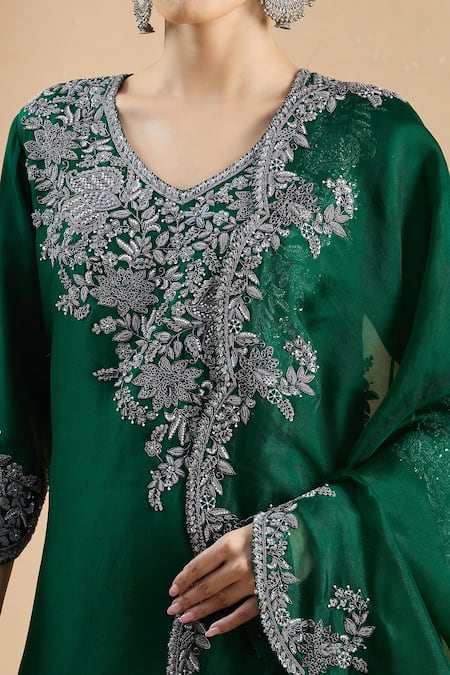 Green kurta featuring zardozi yoke embroidery and bell sleeves. Paired with matching tapered pants. Comes with dupatta.