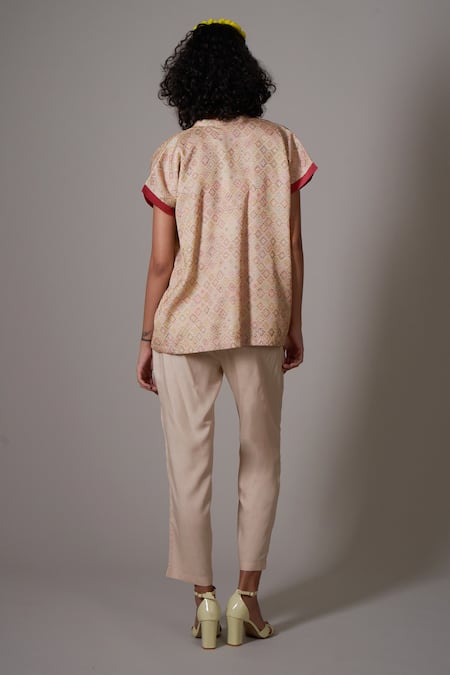 Beige floral embroidered jacket featuring a shawl collar and short sleeves. Paired with a matching mul cotton silk camisole and pant.