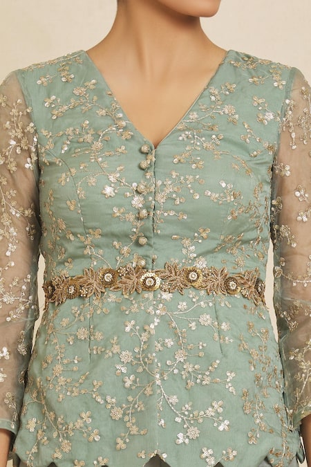Dusty green organza peplum top featuring scalloped cut work hem and all-over floral pattern with zari & sequin embroidery. Paired with umbrella cut palazzo pants.