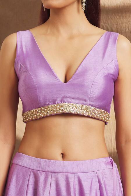Purple Silk, Organza Sequins, Embroidery, Pearls V-neck Hand Blouse Lehenga Set