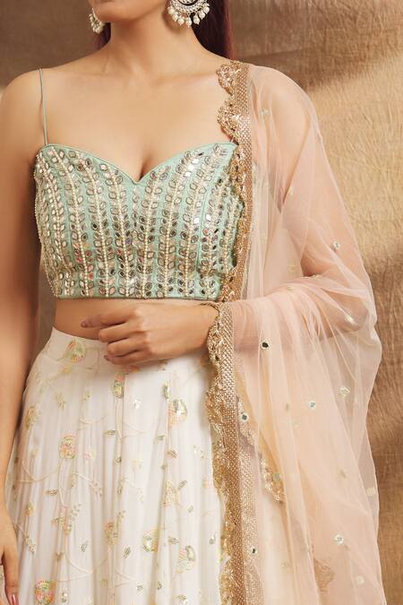 Ivory lehenga featuring hand embroidery with thread, sequins, and mirror work. Paired with a mint raw silk padded blouse and a tulle dupatta.