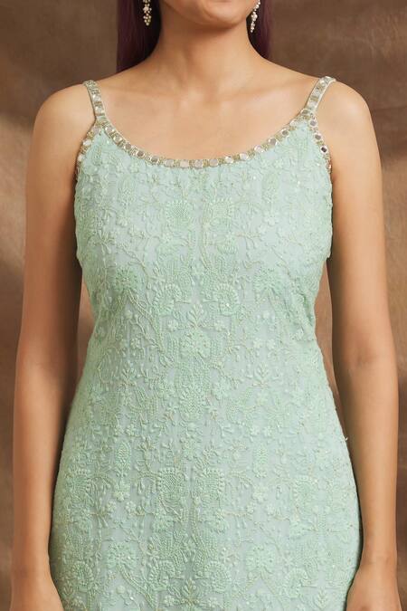 Mint green georgette kurta featuring thread, sequins, and mirror hand embroidery. Paired with a matching sharara and a tulle stole.