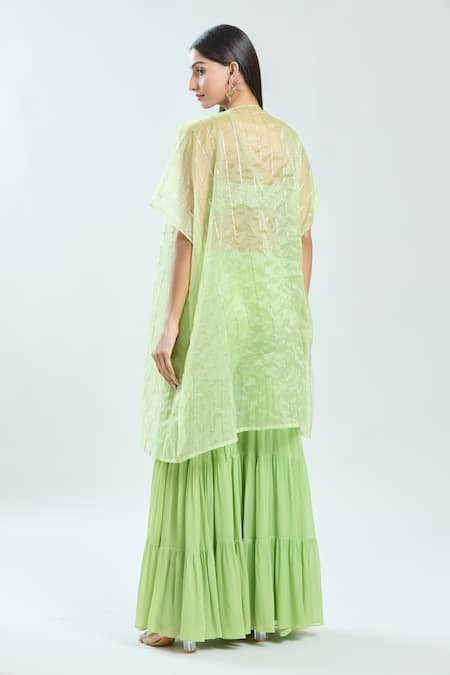 Green Silk, Georgette, Organza Embroidery V-neck Raw Cape Sharara Set