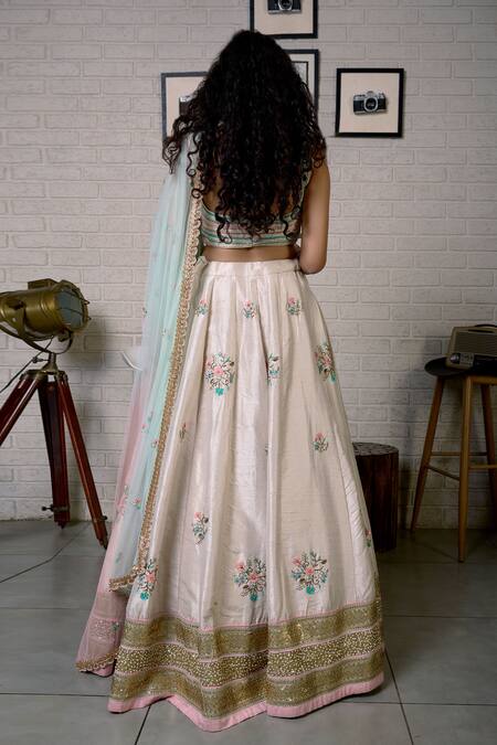 Ivory Silk, Tulle Pearls, Sequins V-neck Raw Floral Embroidered Lehenga Set