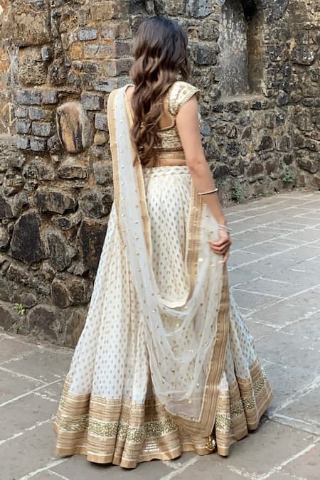 Ivory Silk, Georgette, Tulle Pearls, Sequins, Zari Round Embroidered Lehenga Set