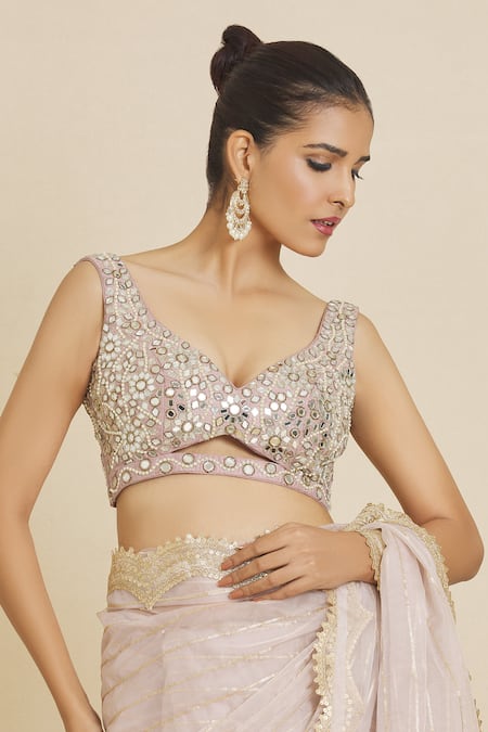 Mauve scallop trimmed saree featuring all over sequin embroidery. Paired with a hand embroidered blouse adorned with pearls and mirror work, featuring a deep V neck and sleeveless design.