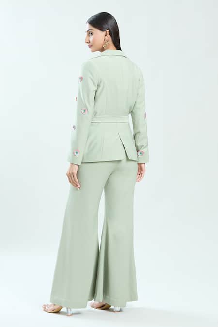 Sage green blazer featuring floral sequin hand embroidery in the front and sleeves. Paired with a flared solid pant and a bustier with a belt.