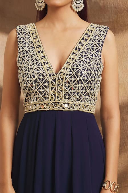 Blue Net, Georgette Mirrors, Pearls V-neck Yoke Embroidered Gown