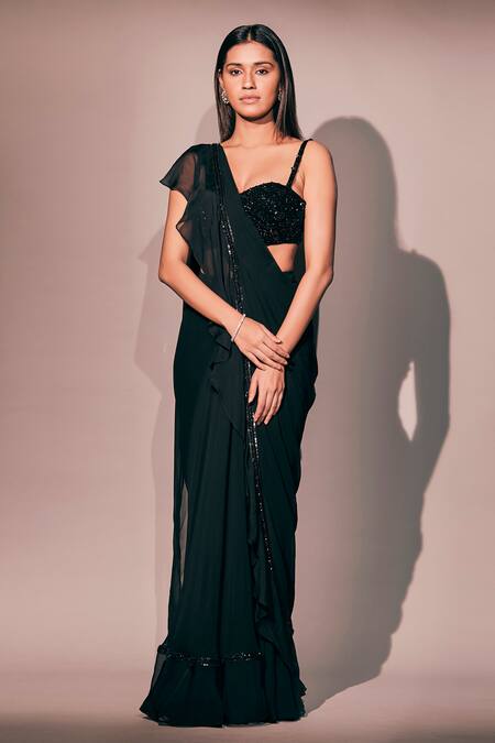 Black Saree Georgette Hand Embroidered Border Pre-draped Ruffle With Blouse