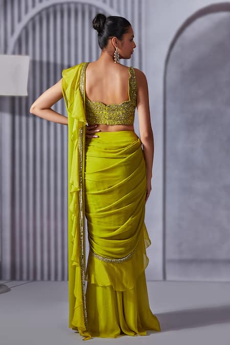 Lime green pre-draped saree featuring ruffles and embroidered borders with pearls, sequins, and cutdana work. Paired with a heavily embroidered scalloped neck blouse and attached lining.