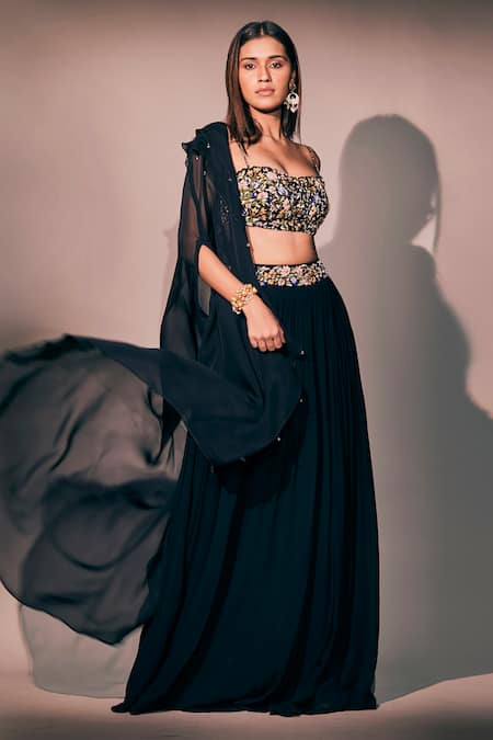 Midnight blue lehenga featuring hand embroidered waistband with thread, cutdana & beads. Paired with a sleeveless padded chanderi blouse and an organza ruffled duster coat.