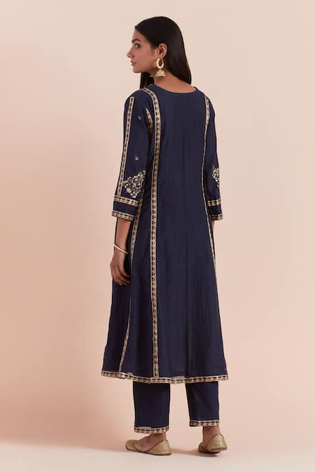 Blue chanderi kurta featuring floral block placement print and a V neckline. Paired with matching pants for a complete look.