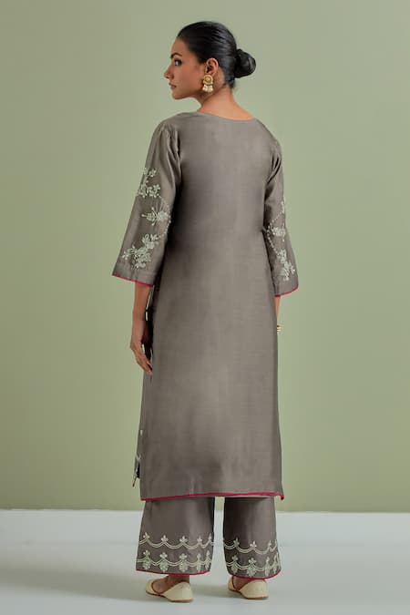 Grey Chanderi Silk Embroidery, Sequins, Cut Work Round Neck Kurta Palazzo Set
