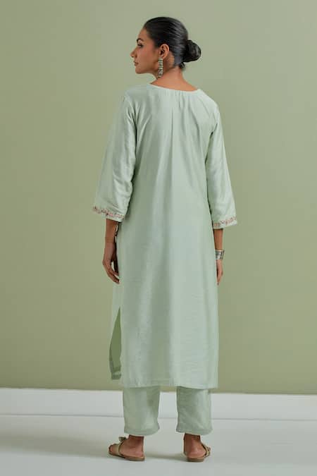 Green kurta featuring floral embroidery and side slits. Paired with a matching pant and lightweight cotton dupatta.