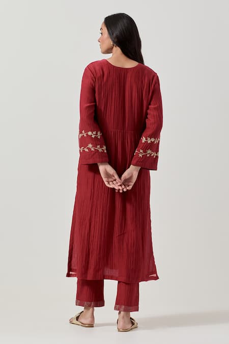 Red kurta featuring floral veil embroidery with key hole neckline. Paired with a pant and a dupatta.