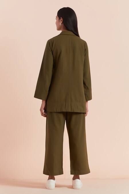 Green Twill Shawl Neck Olive Cotton Top And Pant Set