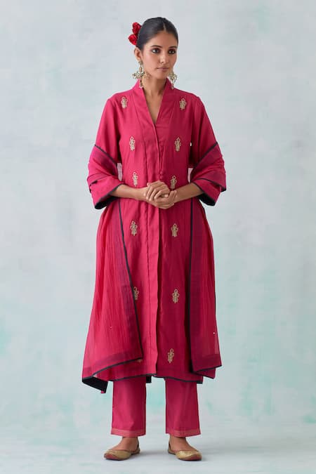 Buy_Priya Chaudhary_Pink Chanderi Embroidery Shawl Neck Plumeria Front Slit Kurta Pant Set
