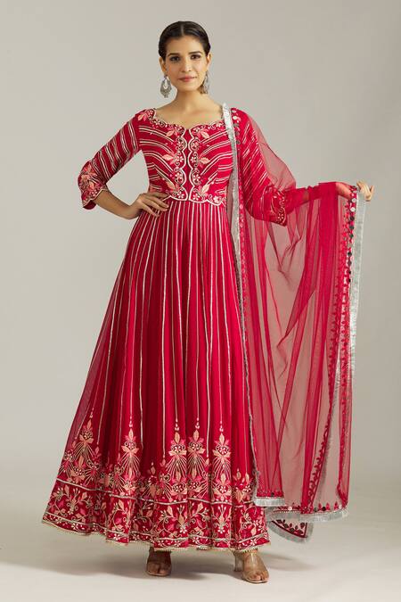 Maroon anarkali featuring embroidered floral motifs and gota patti embellishments. Paired with a farsi pant and dupatta.