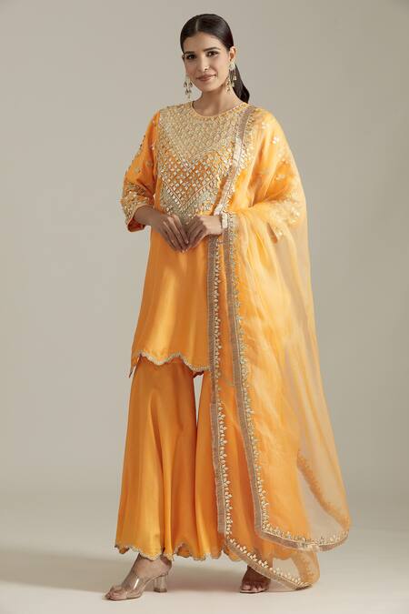 Yellow kurta featuring gota patti embroidered floral motifs and dori embroidery. Paired with a gharara and dupatta, both in matching yellow fabric.