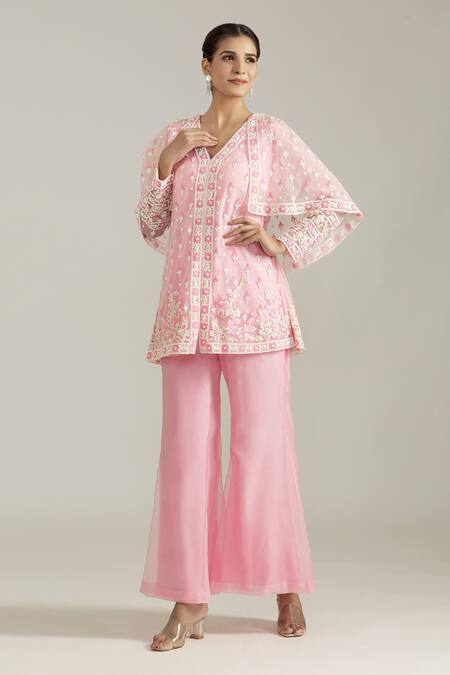 Pink tunic featuring dori embroidered floral motifs with pearl embellishments. Paired with a matching palazzo featuring an elasticated waistband.