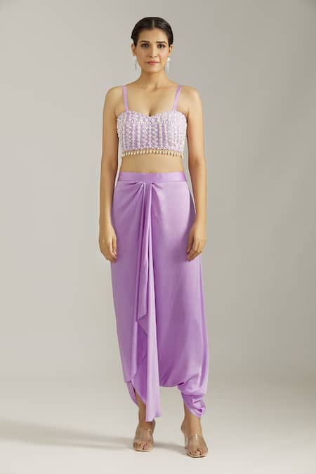 Purple embroidered kurta set featuring a sweetheart neck blouse and an open jacket. Paired with draped harem pants, showcasing cutdana and sequin work.
