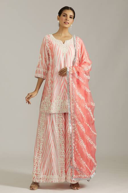Pink kurta featuring dori embroidered floral motifs highlighted by pearls on a tie dye base. Paired with a sharara and a kiran lined dupatta.