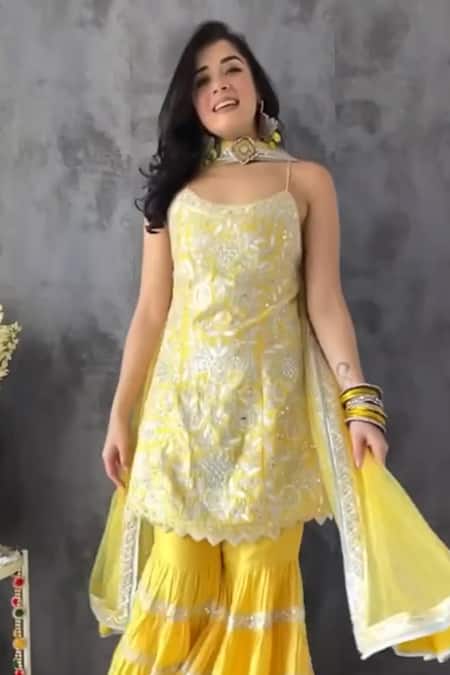 Yellow chanderi embroidered kurta with gota & mirror work. Comes with tiered sharara & dupatta.
