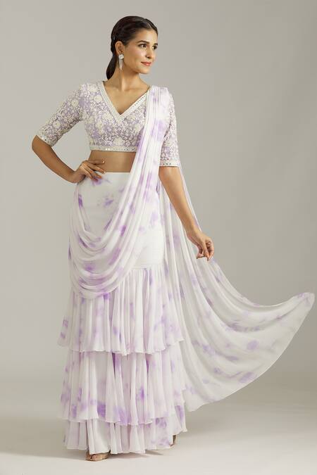 Purple embroidered blouse featuring floral motifs with pearl and thread work. Paired with a tie-dye tiered pre-draped saree.