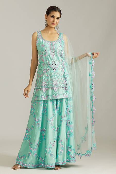 Sea green kurta featuring mirror work embellished floral motifs. Paired with a matching sharara and scalloped dupatta.