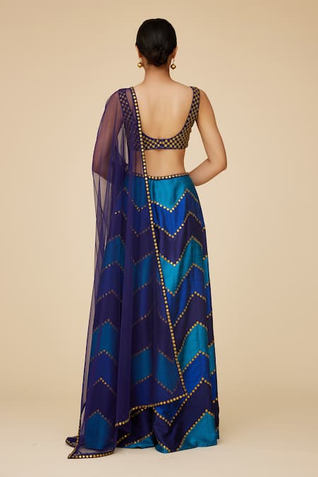 Navy blue blouse featuring a sweetheart neckline and sleeveless design, crafted from raw silk with floral sequin jaal embroidery. Paired with a chevron embroidered palazzo and a border embroidered net dupatta.