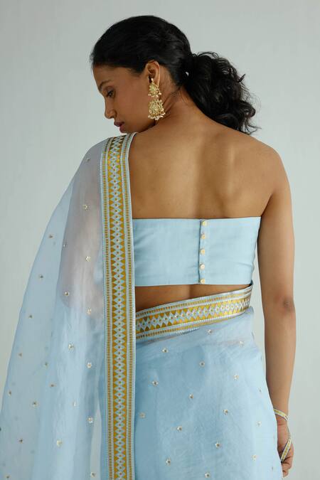 Powder blue saree crafted from silk organza featuring sequins and zari embroidery. Paired with a cotton satin blouse and a poly satin petticoat piece.