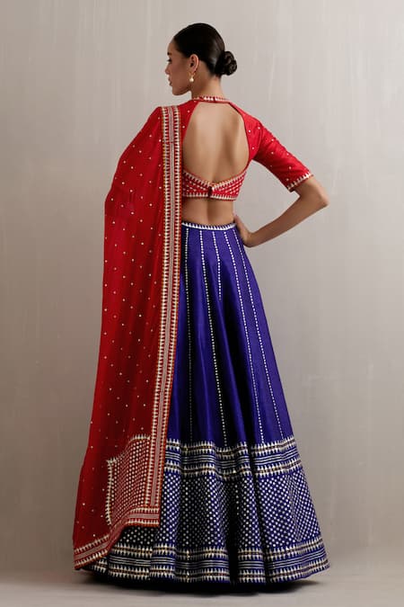 Ink blue lehenga featuring aari, sequin, and zari embroidery in a stripe pattern. Paired with a red half sleeve padded blouse and a matching dupatta.