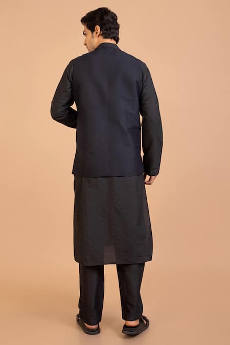 Black bundi featuring all-over thread embroidery and a band collar. Paired with a black kurta and pant.