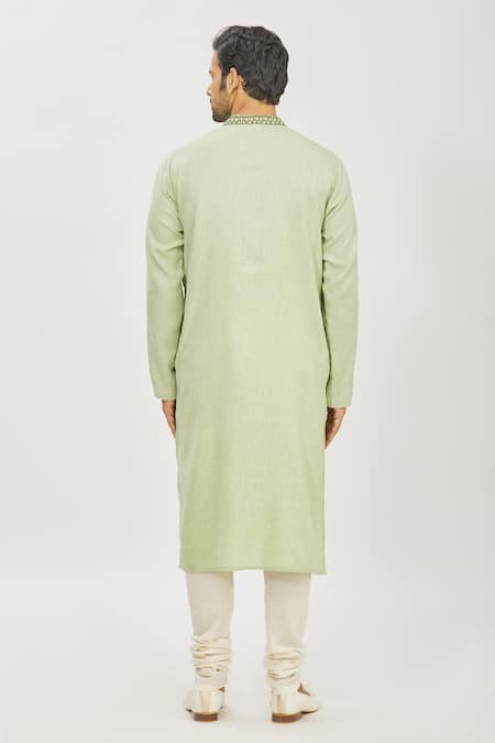 Green placement cord embroidered kurta with a geometric front placket. Paired with off-white solid churidar pant.