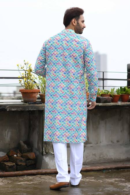 Multi color printed kurta with band collar and full sleeves. Comes with pant.