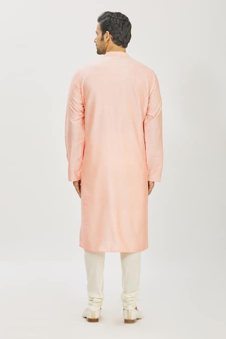 Pink placement hand embroidered geometric kantha work kurta. Paired with off-white solid churidar pant.