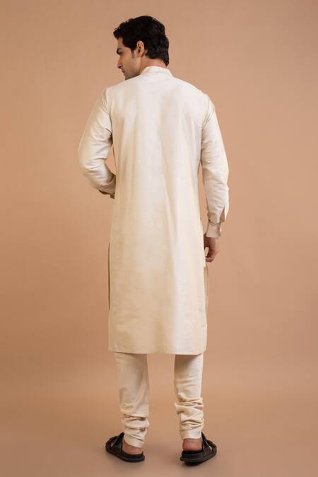 Beige sleeveless bundi featuring quirky foliage embroidery. Paired with a long sleeve kurta and churidar.