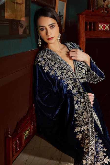Blue Velvet Lining Shantoon Aari Work And Sequin V Embroidered Kurta Palazzo Set