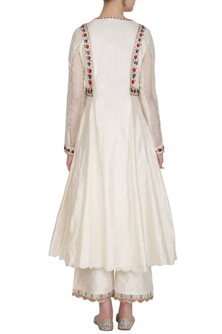 Ivory anarkali with floral embroidered motifs & zari work. Comes with striped dupatta & embroidered palazzo.